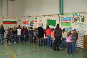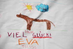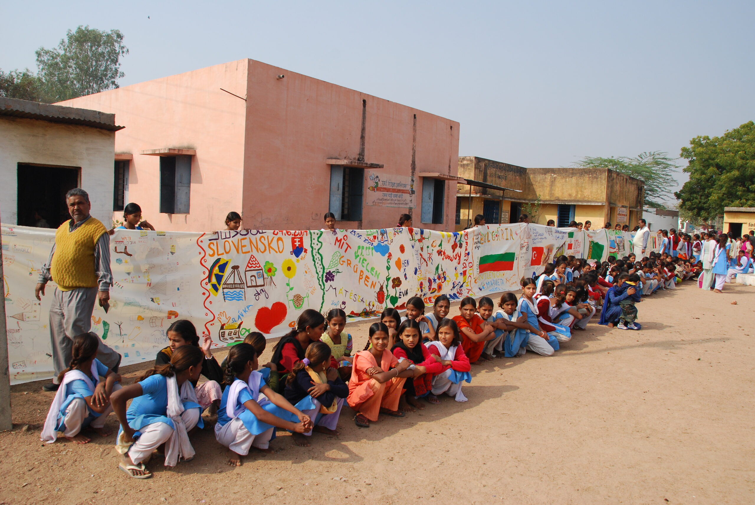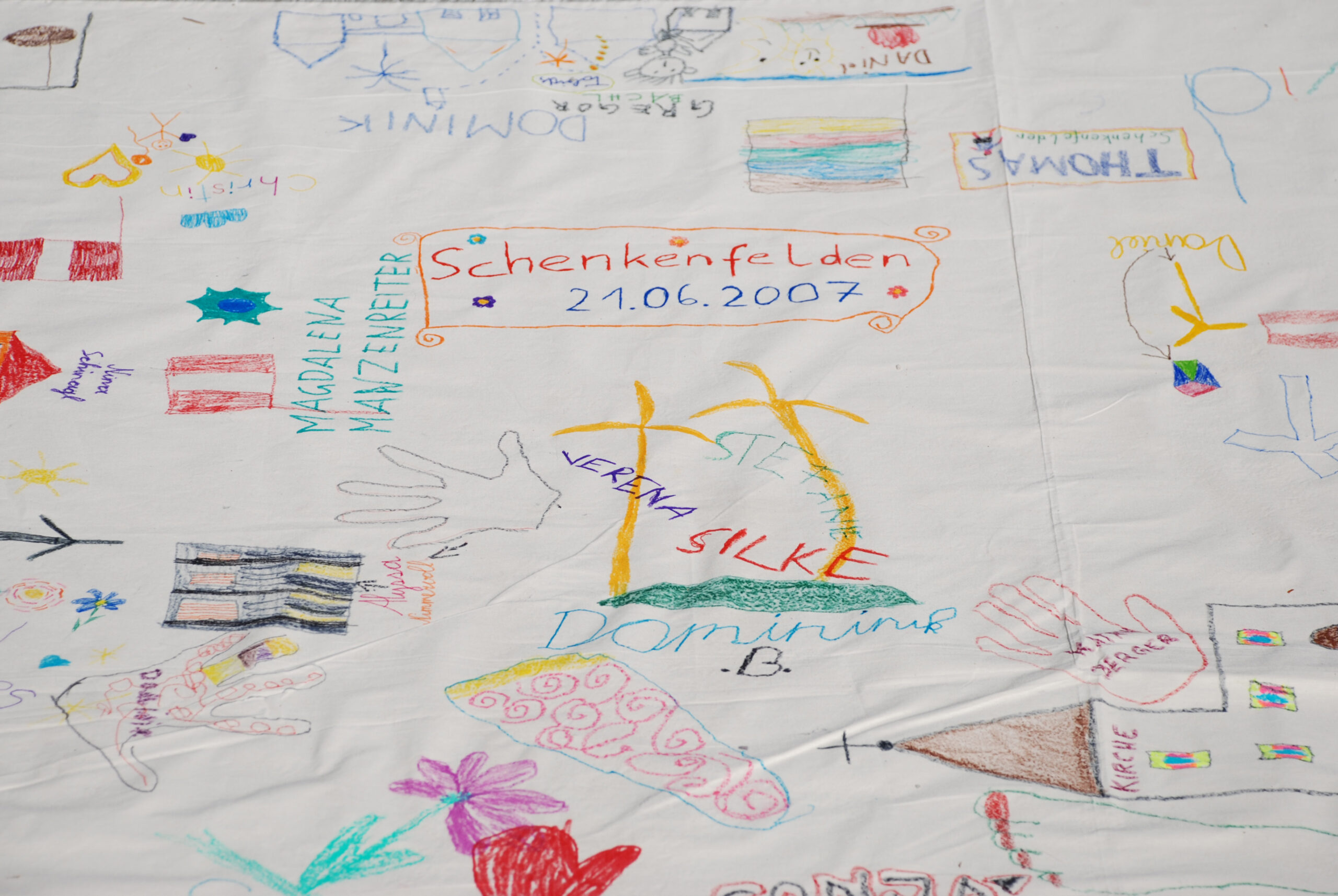 Und diese wunderschönen und originellen Bilder haben mich dazu bewegt, ein 29m langes und 1,6m breites Stück Baumwolle zu kaufen, auf deich Kinder in all den Ländern, die auf meinem Weg nach Indien liegen, die Gelegenheit geben wollte, ihre Gefühls- und Gedankenwelt zum Ausdruck zu bringen, indem sie ihr Land, ihr Dorf, ihre Stadt und ihre Kultur anderen Kindern und auch Erwachsenen in anderen Ländern vorstellen. Für jedes Land waren ca. 3m Fläche auf dem Banner vorgesehen, und den ersten Teil des Werkes haben 60 Volksschulkinder in meinem Heimatort Schenkenfelden mit Filzstiften bemalt. Zuvor haben ich ihnen in einer Diashow einige Bilder aus Indien gezeigt, ihnen uüber meine Reisepläne erzählt und ihnen versprochen, dass ich mit dem fertig bemalten Banner in eineinhalb Jahren wieder bei ihnen auftauchen werde. Und mit einem berührenden Abschiedslied über meinen Heimatort haben sie mich dann schliesslich verabschiedet.