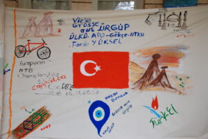 In der Türkei hatten die Sommerferien schon angefangen, aber ich hatte relativ viel Zeit zur Verfügung. In vollen Zügen genoss ich die wunderbare Landschaft Kappadokiens und fand vor dem Tourismusbuero in Ürgüp einen gut geeigneten Platz für die Malaktion. Die Chefin, eine begnadete Künstlerin, malte einen wunderschönen Sonnenuntergang über Kappadokien und einige Mitglieder ihrer Familie beteiligten sich ebenfalls an dem Kunstwerk.