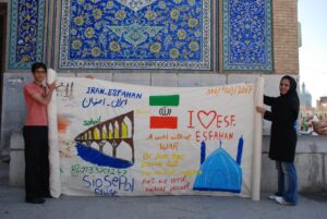 Im Iran schließlich lernte ich eine sehr nette Familie kennen, mit deren Unterstützung ich auf dem großen Imam-Platz in Esfahan, der von wunderschönen Gebäuden und Moscheen umgeben ist, die Aktion durchführen konnte. Einige verschleierte Mädchen und Frauen beteiligten sich ebenfalls am Zeichnen und Malen, und ein Jugendlicher brachte mit seiner Botschaft einen brennenden Wunsch vieler Iraner sehr klar zum Ausdruck: „Wir werden nie Atomwaffen benützen. Aber wir brauchen die Atomkraft!”