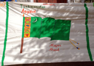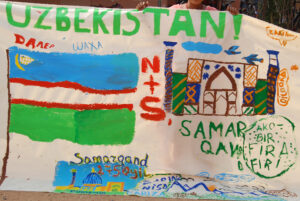 In Usbekistan kam ich mit einem Besitzer eines Souvernirladens in Samarkand ins Gespräch, vor dessen Geschäft ich dann mein Banner ausrollte und vorbeikommende Kinder zum Malen einlud. Bald waren an die 20 Kinder voller Begeisterung am Malen und viele westliche Touristen schauten interessiert zu. Leider habe ich von diesem Ereignis und auch von dem in Ashgabad/Turkmenistan keine Originalfotos, da alle meine Daten verloren gegangen sind durch den Diebstahl meiner Speicherkarten und die defekte Festplatte meines Laptops in Pakistan.