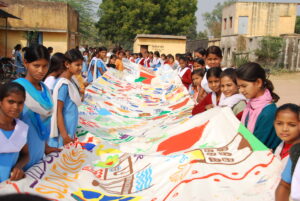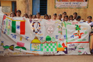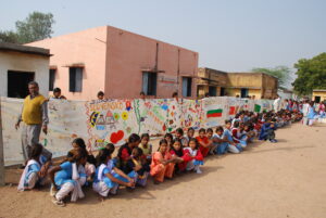 In Indien fand dann meine Malaktion in Khajuraho, das wegen seiner vielen wunderschönen Jain-Tempel mit eindeutig erotischen Darstellungen auch die “Stadt der Liebe” genannt wird, ihren krönenden Abschluss. Unter den mehr als 200 Schülerinnen der Mädchenschule suchte der sehr kooperative Direktor 20 talentierte Mädels aus, die sich zuerst untereinander absprachen, was sie machen wollten, und dann alles mit Bleistift vorzeichneten. Einige Details konnten dann leider nicht mehr ganz verwirklicht werden, da der Tag bereits zu Ende ging und es in der Schule keinen Strom gab. Nächsten Tag rollten wir dann vor der Schule das Banner in seiner vollen Länge aus, und die Mädchen bestaunten die vielen bunten Bilder aus den unterschiedlichen Ländern und Kulturen. Ein Reporter der lokalen Presse zeigte sich ebenfalls recht begeistert von dem Projekt und brachte einen Bildbericht in einer regionalen Zeitung. Als kleines Dankeschön verteilte ich Filzstifte und Süßigkeiten an die 20 Mädchen und schenkte der Schule meine restlichen Farbtöpfe, für die ich ja nun keine Verwendung mehr hatte.